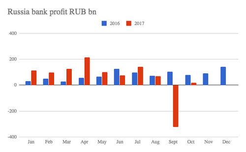 Russia’s banking sector earned an aggregate profit of just 18 billion rubles ($300mn) in the first 10 months. But, if you exclude state-owned retail giant Sberbank’s stellar third-quarter results, then the sector is actually still loss-making.