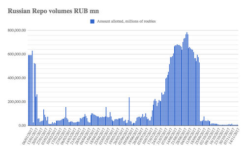 The upshot of the near-miss bank crisis is that there was a flight to quality that massively benefited the state-owned banks that enjoy guarantees from the state. The bankers themselves seem less concerned as the volume of repo borrowing from the CBR – a short-term and very expensive mechanism to tap the central bank for cash – have plummeted in the last month and is back to normal.