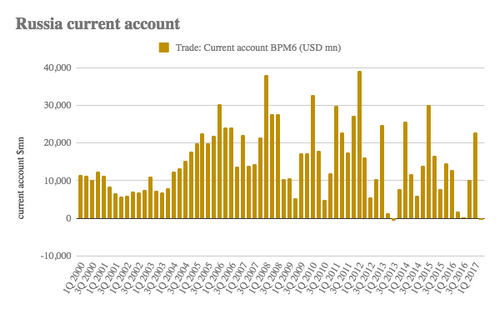 Indeed, as the economy starts to recover and the first green shoots of consumption recovery are showing, imports are rising again; Russia ran its first negative current account balance in the second quarter in years, albeit of only $300 million.