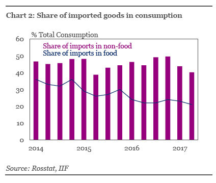 The agricultural sanctions imposed by the Kremlin on Europe have had the most notable effect on consumption patterns. The share of imports in private food consumption declined noticeably from 36 percent in 2014 to 21 percent in the second quarter of 2017, the IIF study found, while non-food imports, which are largely unsanctioned, have been much more stable.