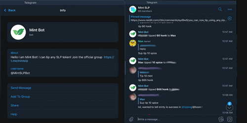The bot can be easily added to any Telegram group chat and start tipping any SLP tokens to your liking. Direct message the bot for help with this, use the whitelist commands it tells you about to set the bot up in your own Telegram group chat.