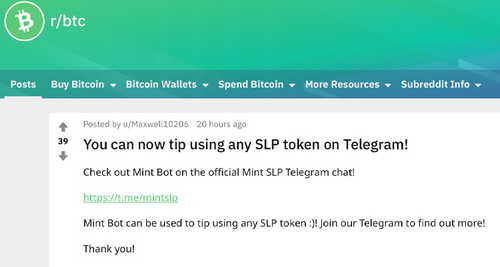 The Telegram SLP tipping bot Max and his brother created was well received on the Reddit forum r/btc the day he announced the launch. One user commented that the developers should implement the bot with the Matrix/Riot messenger service and said the Telegram-like application is “picking momentum quickly and it has an API for bots.” The Mint Bot follows the SLP tipping bot that tips spice tokens (SPICE) and is used in various Telegram chat rooms. Additionally, there’s the Button Wallet bot news.Bitcoin.com tested last May that leverages bitcoin cash (BCH), but doesn’t support SLP tokens. With the ability to use any SLP token, Max and his brother’s new Mint Bot is one of a kind.