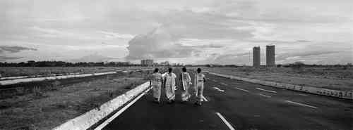 In New Town, De has captured the changing landscape-farmers at work in the fields, with tall buildings looming behind them. On one wall of the exhibition, the toll gate of Hampi is positioned next to a newly-laid road connecting New Town to Kolkata. On another wall, there is an image of an under-construction flyover, surrounded by concrete slabs and heavy machinery, placed next to a photograph of a centuries-old stone wall built by hand. “In the one, we see the past perfections frozen in stone”, writes Indian-American author Kalyan Ray in a note on De’s work. “Within the other, we witness the emergence of the forces of change-with a phalanx of distant buildings gaining upon the virgin soil.”