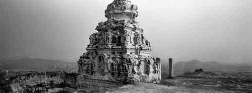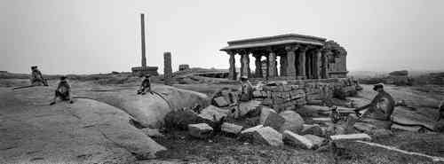 Over the last eight years, De has taken more than 1,500 photographs of the two places, of which around 30 are included in the Delhi show. His black-and-white photographs of Hampi reflect the stark beauty of the UNESCO world heritage site. There are, for instance, caption-less images that show a structure held up with stone pillars that once housed a large bazaar; and the Talarigatta, the toll gate that was the main entrance point to the capital and temples where people would congregate.