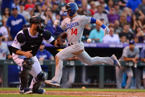 Enrique Hernandez of the Los Angeles Dodgers beats the throw to Colorado Rockies catcher Chris Iannetta to score a run on a sacrifice fly in the second inning of Thursday night’s game at Coors Field. (credit: Dustin Bradford/Getty Images)