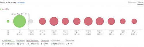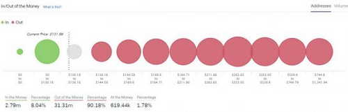 Out-of-the-money addresses are holding 73.13 million ethers. Clusters of addresses with an average price in the range of $144-$170, $212-$262, or $262-$352 are holding a total of 36.24 million ethers.