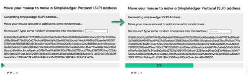 To run the page locally, open the SLP Paper Wallet folder and open the HTML file called “slpwallethtml.” From here, your browser will open and the program will ask you to create randomness and entropy using either your mouse or by texting characters with the keyboard. You can simply move your mouse around until the green progress bar changes from 0% to 100%. Or you can type a bunch of random keys into the box until the green progress bar completes as well. You can create a bunch of SLP paper wallets in this manner by simply creating randomness for every key generated.
